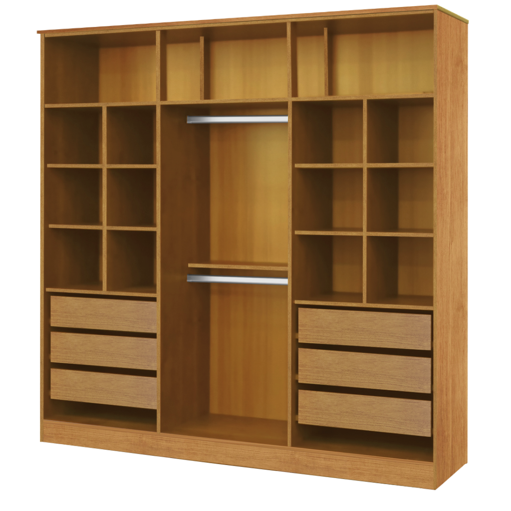 Produzido em 100% MDF, o modelo conta com estrutura reforçada, seis portas de bater e seis gavetas internasequipadas com corrediças telescópicas, garantindo abertura suave, maior durabilidade e resistência ao uso contínuo. O diferencial fica por conta dos nichos laterais no sistema “Ele e Ela”, que facilitam a separação e organização das roupas do casal.