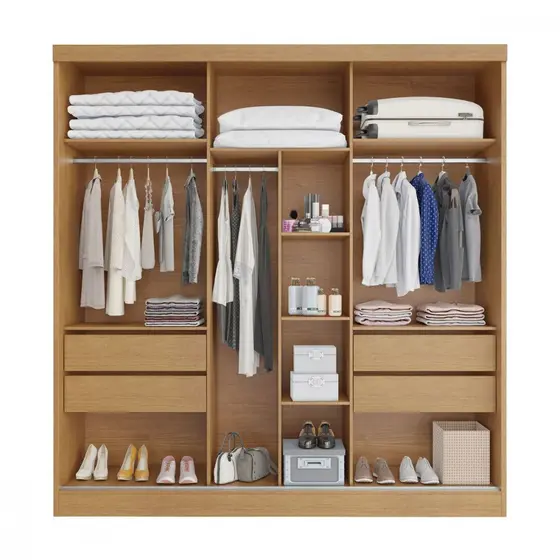 Sua estrutura 100% em MDF garante durabilidade e acabamento superior, enquanto o interior conta com o sistema “Ele & Ela”, que oferece organização otimizada e espaço de sobra para roupas curtas, longas, acessórios e itens pessoais.