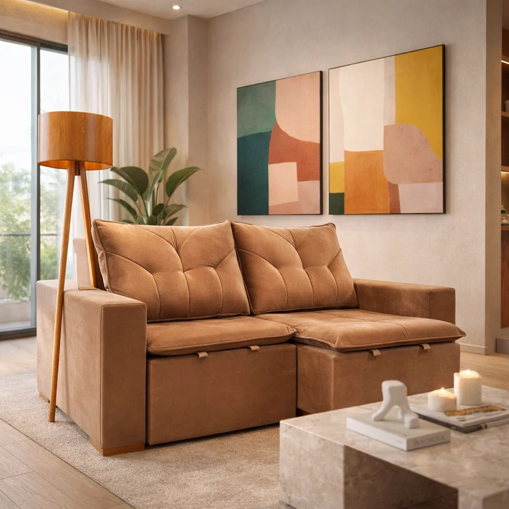 Design compacto com conforto de sofá grande. Solução ideal para espaços urbanos e ambientes planejados.