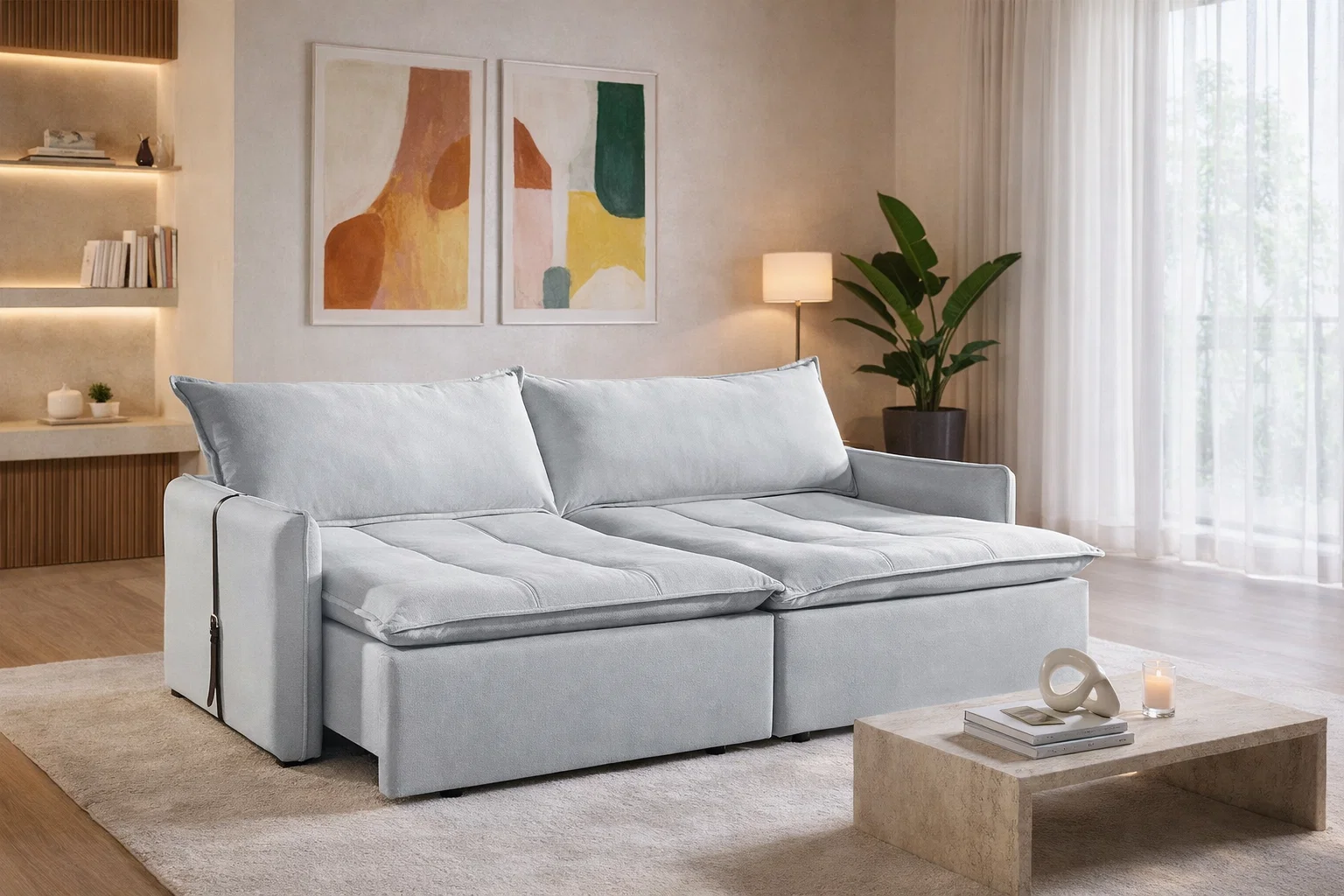 O Sofá Sevilha é a escolha ideal para quem busca unir sofisticação, conforto absoluto e inteligência no aproveitamento de espaço.