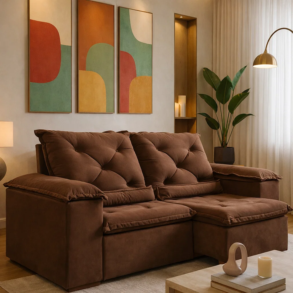 Sofá retrátil e reclinável de 3 lugares, pensado para quem busca conforto real no dia a dia. Espuma D-30 Soft Premium, pillow top e design elegante que transforma a sala.